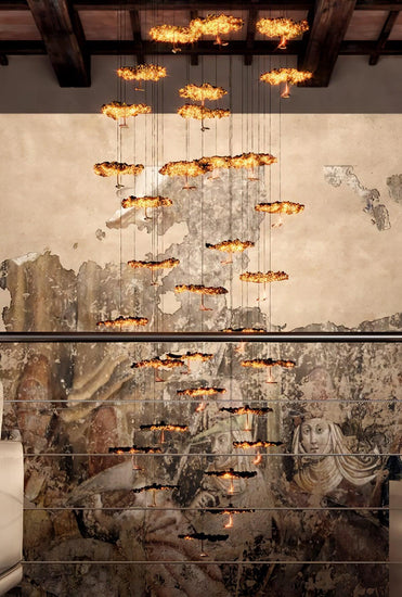 The Brass Aviary Constellation Chandelier showcases carefully arranged metal fragments in a crescent moon motif. enhancing the aesthetic of any living space. Its dome-like canopy is purposefully shattered to create a captivating centerpiece on your ceiling. This vibrant steel-clad chandelier light emits brilliance in every direction. making it an ideal dining area chandelier and a stunning house light. Embodying the perfect blend of celestial charm and luminous beauty. it serves as both art and illumination in your home.