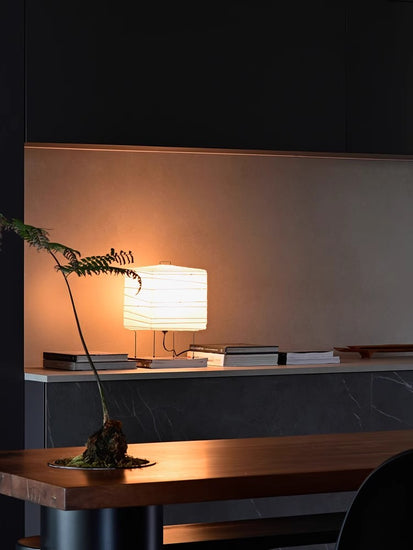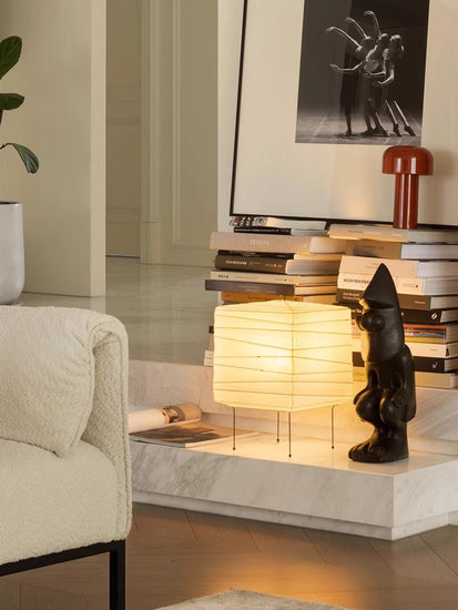 Elevate your space with the Ayla Cube Table Lamp. where minimalist design meets sculptural elegance. Inspired by traditional paper lanterns. this modern piece features a striking cubic form. with carefully crafted folds that add texture and charm to its soft illumination. Its slender black wire legs create the illusion of floating light. while a sleek handle atop the lamp adds a touch of practicality for effortless portability. The Ayla Cube is more than just a lamp—it's a piece of art that brings warmth and sophistication to any room.