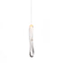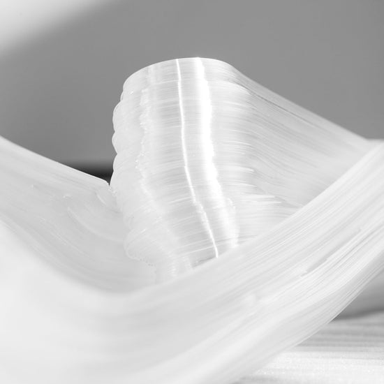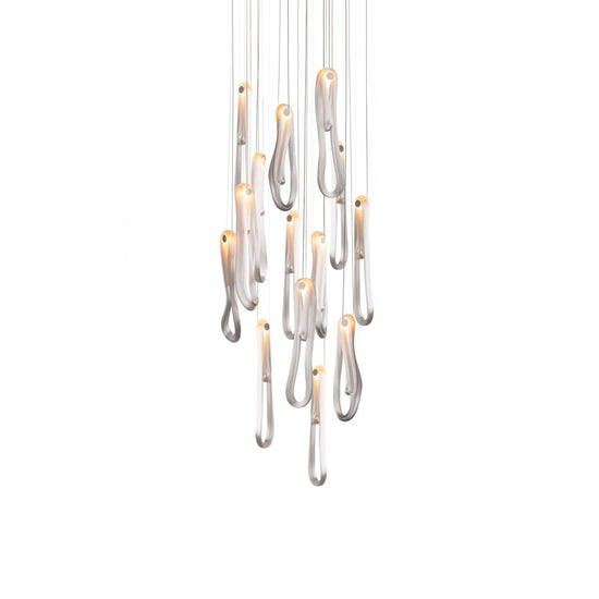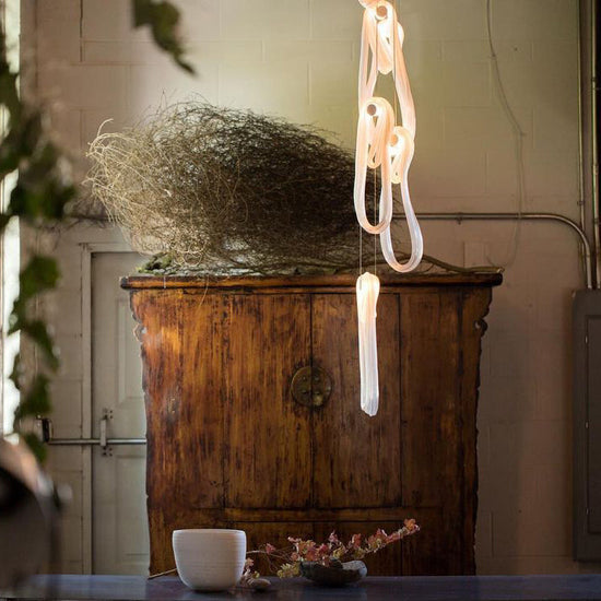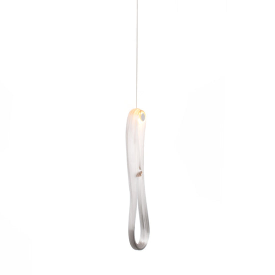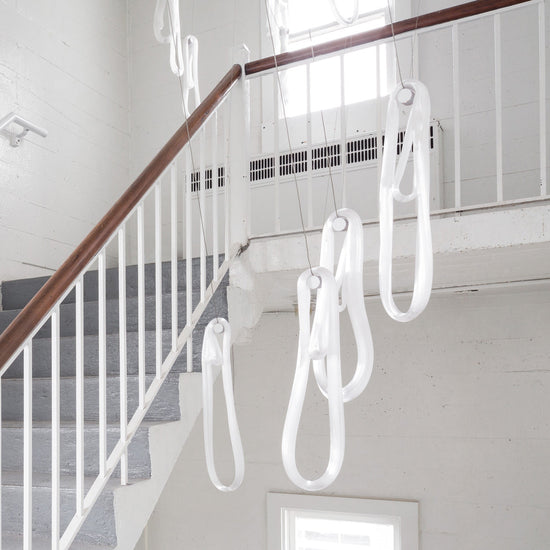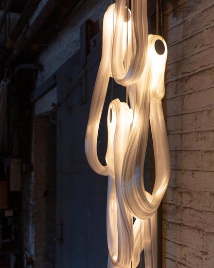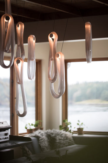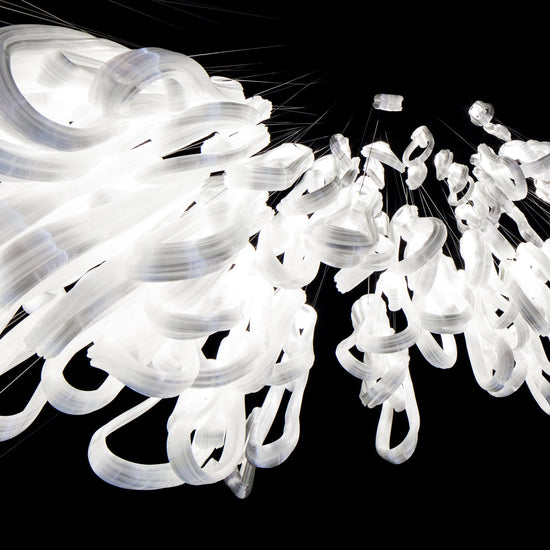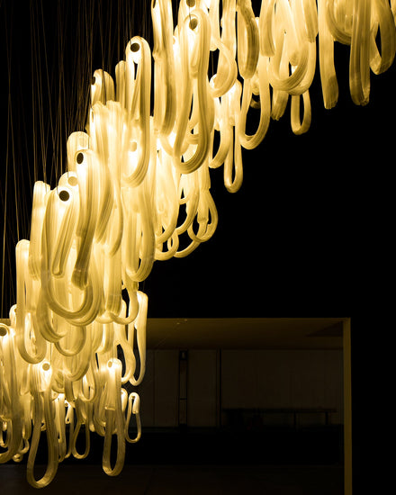 Soda water is used to trap air in a super heated glass matrix. which is vertically stretched and folded back onto itself between pegs numerous times. As the glass cools. the folding motion along the grain of the loop turns the entrapped air into microfilaments that give the piece a pearlescent optical quality. A low-voltage xenon or LED light source is introduced at one end of the loop casting light through the microfilaments and registering a gentle gradient.
