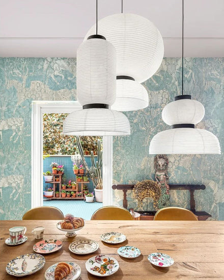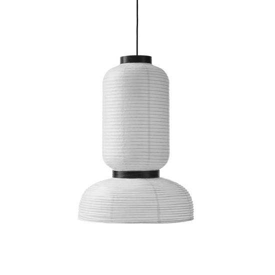 Formakami pendant light is a modern take on classic Asian paper lanterns. Our aim was to create a light pendant that illuminates people's lives both literally and symbolically. The white color of the shade emphasizes the lightness of rice paper and the open bottom maximizes the amount of light. Black stained oak rings give Formakami's handmade shade a pleasant rhythm. known for his playful designs. has combined round shapes in different sizes. and the end result is a collection of three unique pendant lights.