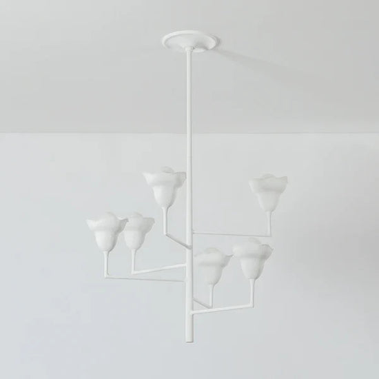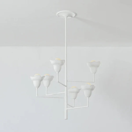 Architectural and sleek, but with an artful, botanical flourish, the Georgie Pendant has strong modern design appeal. While the framework features clean lines and right angles, the scalloped floral shades have an irregular, hand-sculpted quality. A textural relief pattern on the surface of the shades adds visual interest.