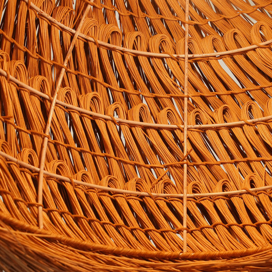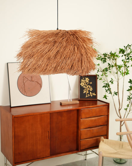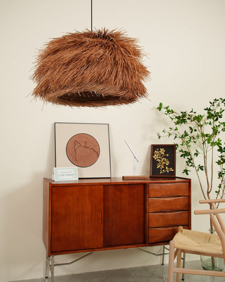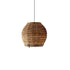 Woven from natural wicker. the pendant boasts a conical shape that tapers with an effortless grace. The intertwining strands of the wicker create a semi-transparent cloak around the light. allowing for a soft. mellow glow that resembles the last light of sunset. This light fixture is suspended by a slender. unassuming metal cord that complements its rustic charm without distraction.