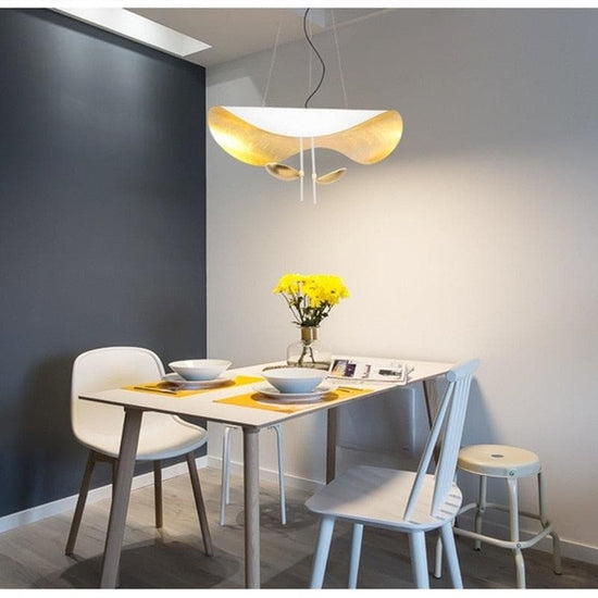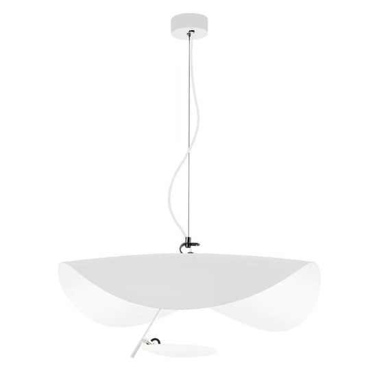 The Lederam Manta pendant lamp features an elegant curved shade that embodies the fluidity and precision of movement required to draw lines. with a disc extending from a metal rod. The finish is white and available in white. black or gold strips.