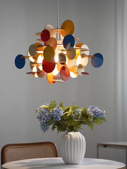 Made up of playful overlapping discs in bright hues of blue. red. yellow. and natural wood. it brings a lively. artistic energy to any room. Perfect for adding personality to dining areas. living rooms. or creative spaces. this pendant light doubles as both illumination and modern art.