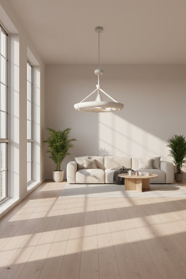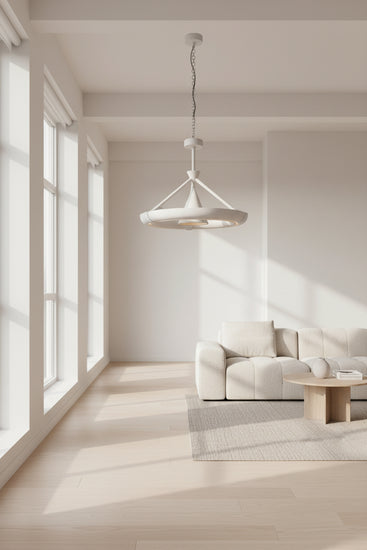Each piece is individually cast and finished by hand, revealing subtle variations that celebrate the artistry of craftsmanship. The plaster surface diffuses a gentle, natural light, creating a soothing atmosphere perfect for living rooms, dining areas, or high-ceiling interiors.