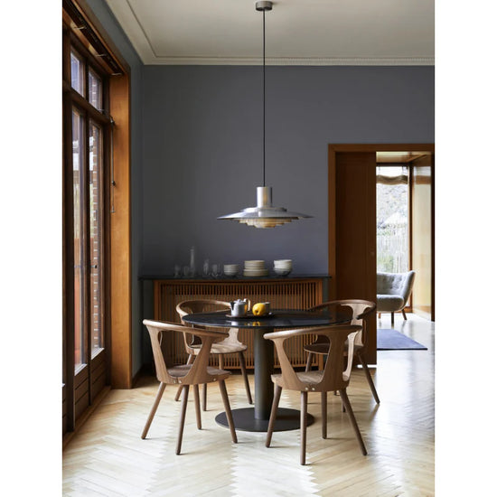 Jørgen Kastholm (1931-2007) and Preben Juhl Fabricius (1931-1984) were driven by a mutual mission to make form a pure derivative of function. Both were architects, graduating from the Danish School of Interior Design where they studied under Finn Juhl and subsequently with Arne Jacobsen. The P376 pendant lamp is a perfect example of Kastholm & Fabricius’ subtle architectural slant on design. Originally conceived in 1963, five concentric shades create gradations of curves towards the middle of the lamp to emit a soft, diffused light. The discrete placement of the shades and the silky aluminium finish culminate in a cohesive expression that’s both iconic and enthralling.