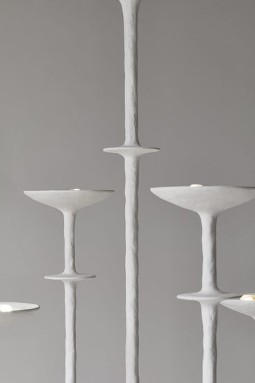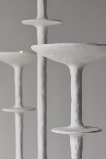 The Paros chandelier embodies minimalist elegance through its sculpted plaster form and refined geometry. Each curve is hand-shaped with precision, giving the piece a tactile depth that softly interacts with light. The matte plaster surface diffuses illumination gently, creating a serene and atmospheric glow.