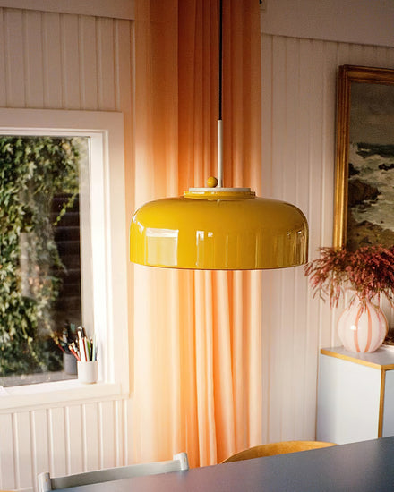 Expertly designed by Mooijane. the Podgy Pendant Light adds a touch of Nordic Yellow Minimalism to your home decor. Its modern and sleek design elevates any space. while the built-in LED bulb provides added convenience. The yellow lampshade creates a cozy and welcoming atmosphere. perfect for any occasion. Illuminate your dining room with style and functionality.