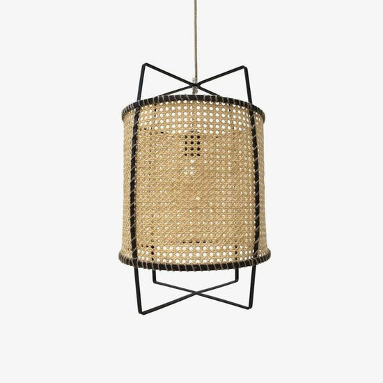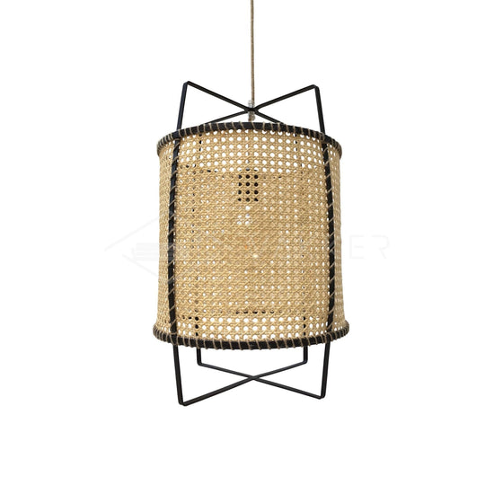 The frame of the light. the ceiling plate and the socket cover. are made of metal and comes in the finish you wish. We offer black or white metal frame finishes. The rattan cane webbing is hand stitched on the metal frame by using a natural jute cord. The ceiling canopy comes in the same finish as the metal frame and the bulb socket cover.