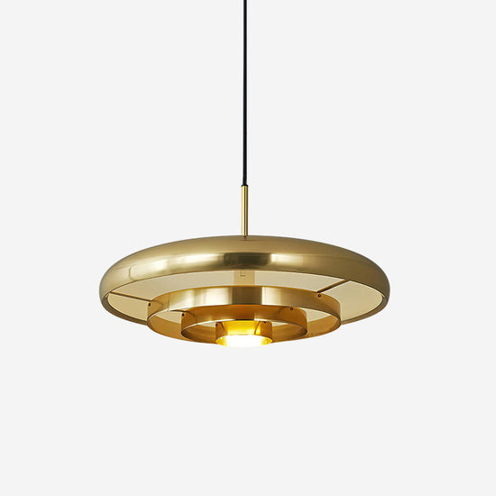 The Resonant Pendant Lamp strikes a perfect balance between sculptural form and radiant function. with its concentric circular design echoing the harmony of sound waves. Crafted in a gleaming brass finish. it reflects light with a warm brilliance while its layered structure directs illumination downward in a focused yet atmospheric way. A statement piece for dining areas. lounges. or modern interiors. this pendant transforms any space with its bold geometry and luminous elegance.