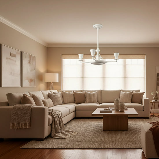 Sculptural fixture in plaster with three extending arms and cups at the end of each. Beautiful center structure and canopy. Each cup comes outfitted with a 2-pin G9 socket, suitable for halogen or LED bulbs. If the fixture is to be UL listed, candelabra bulbs must be used instead. Please consult us upon ordering.