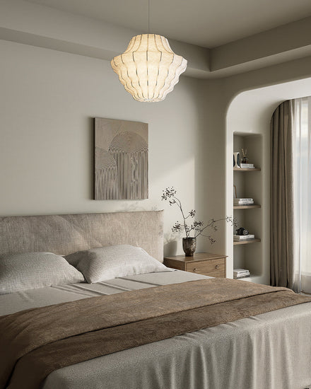 Crafted with luxurious silk. this stunning light fixture adds a touch of sophistication and warmth to any bedroom or living room. Elevate your space with the perfect combination of Japanese and Scandinavian design.